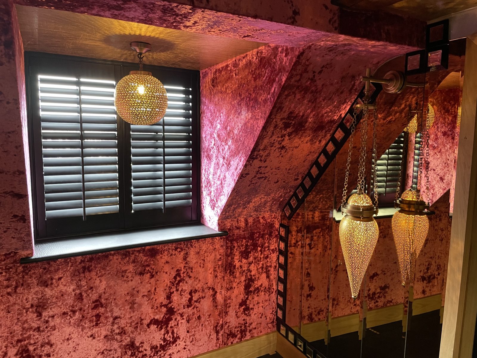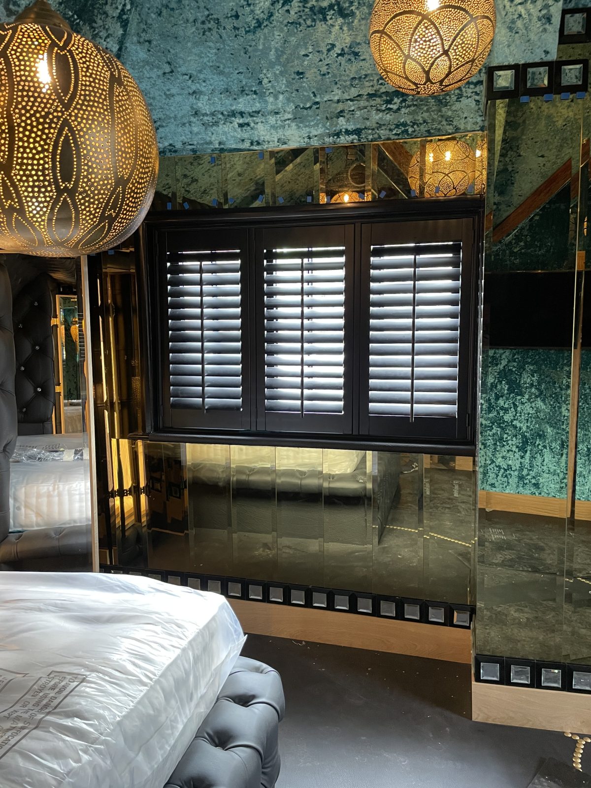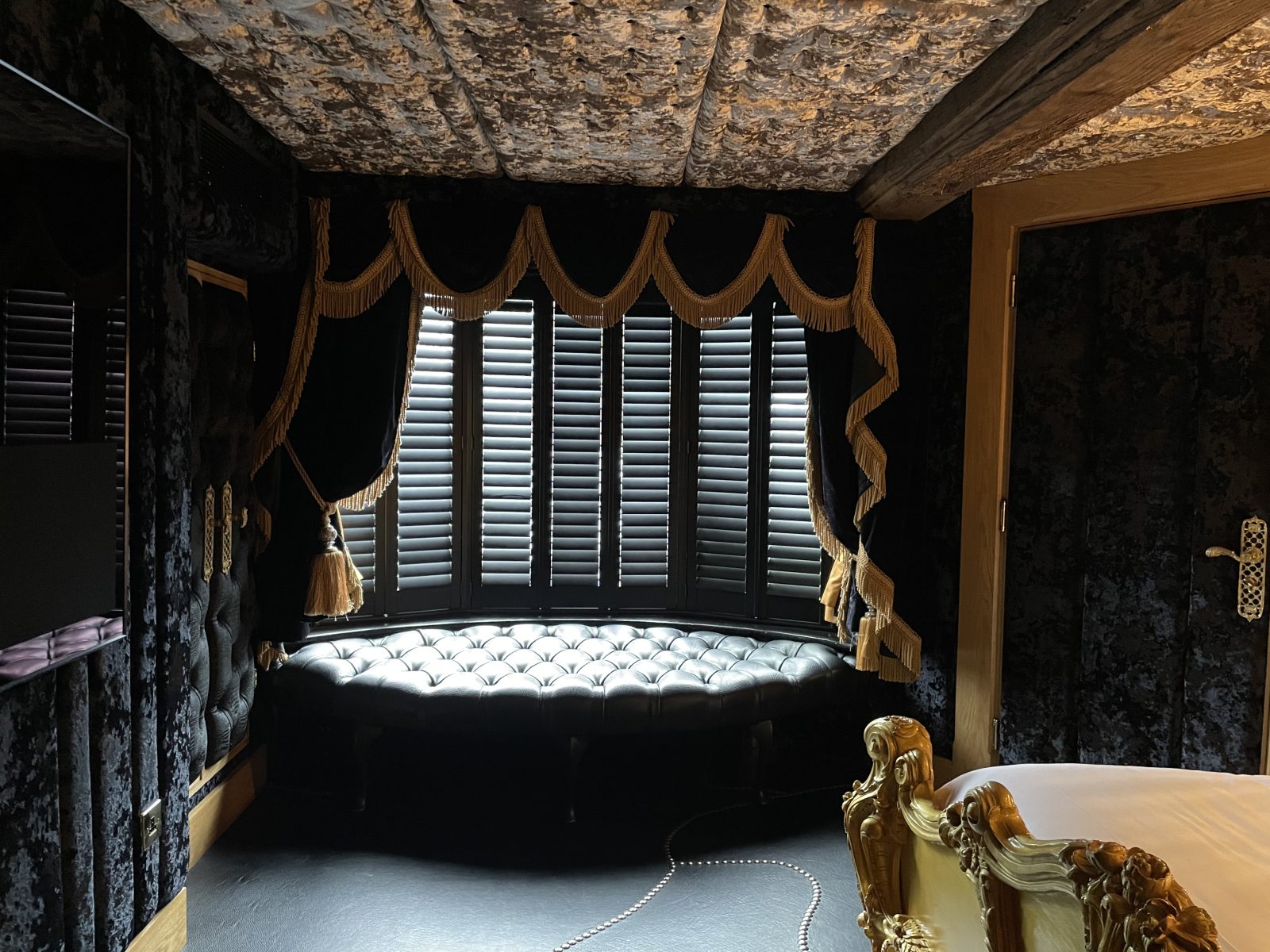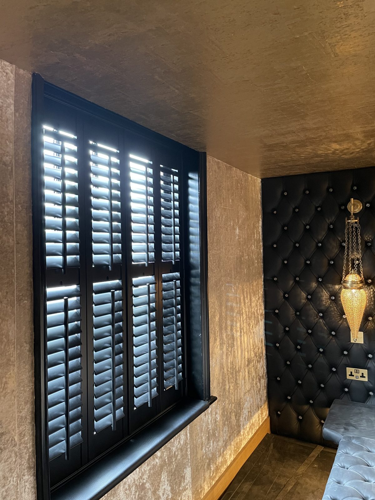 Long Island Shutters recently installed black shutters at the distinctive Crazy Bear hotel in Beaconsfield. These shutters, featuring 64mm louvres and an easy tilt internal mechanism, offer both style and functionality. Our work at the Crazy Bear hotel demonstrates our commitment to providing high-quality, tailored solutions for unique hospitality settings.