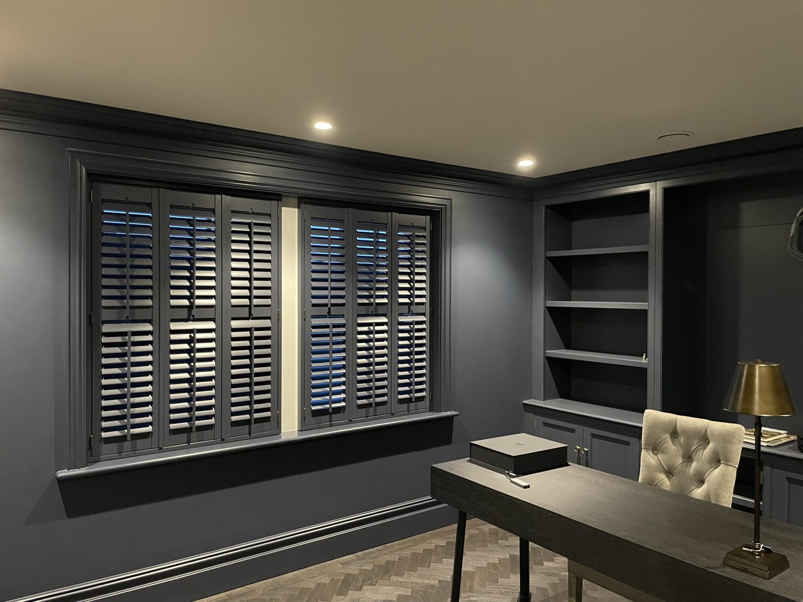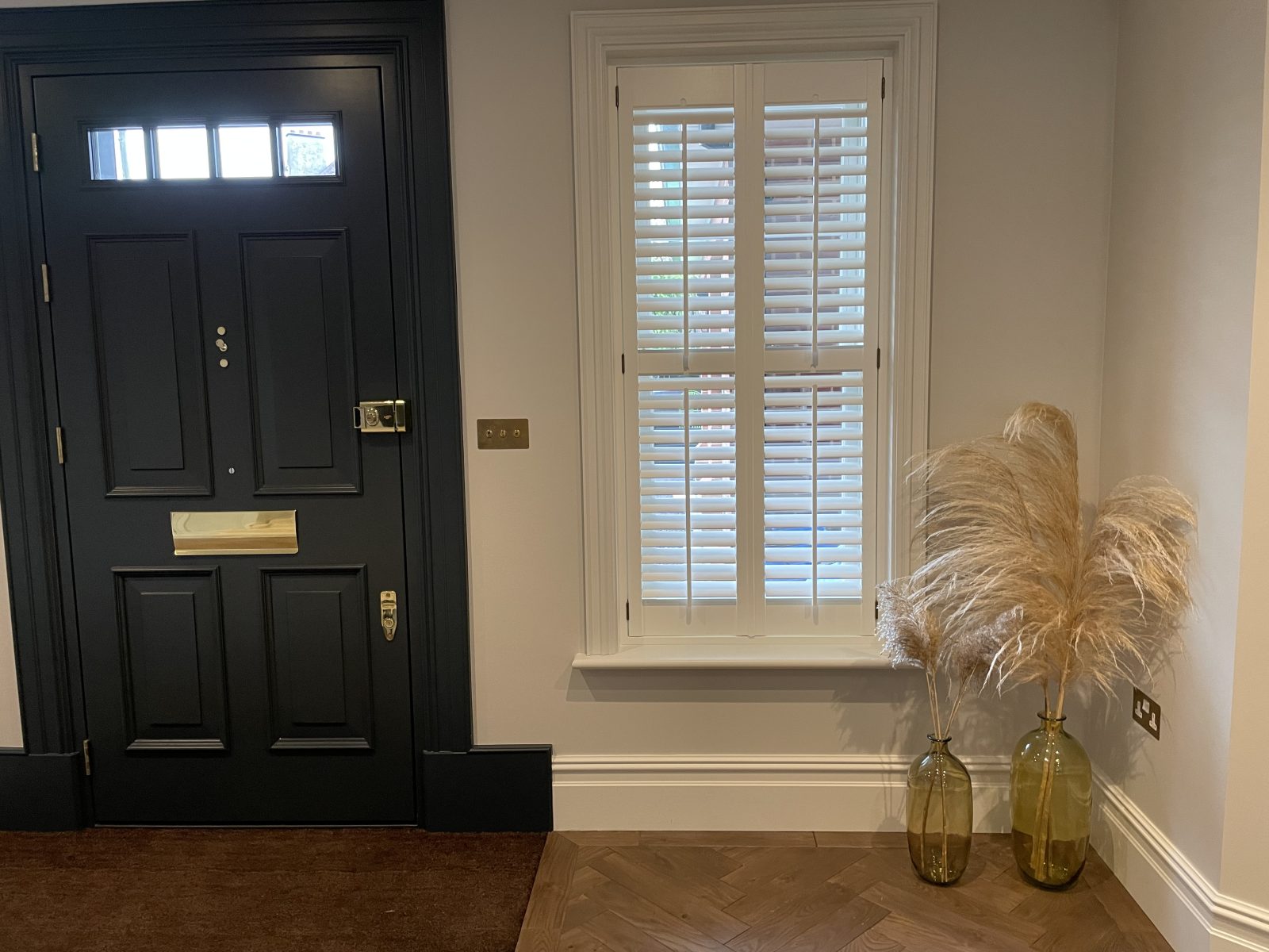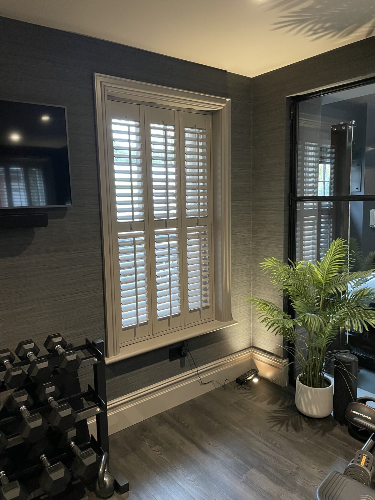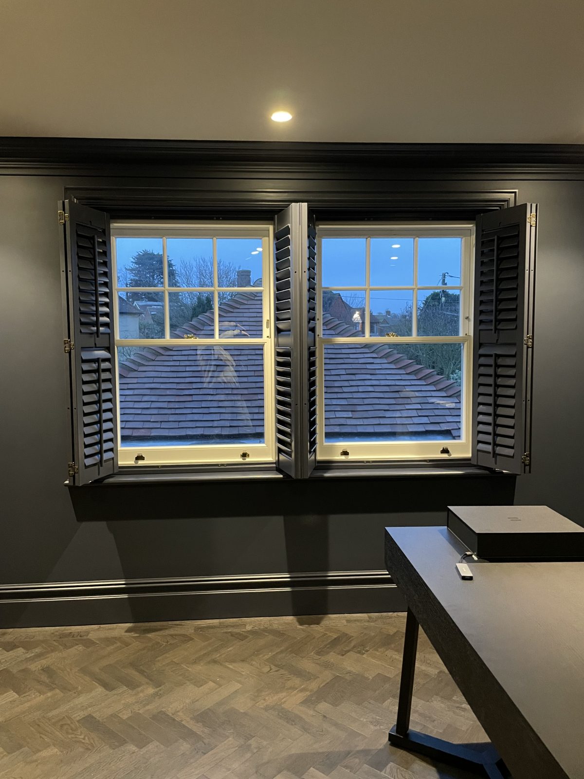 Long Island Shutters completed a project for a new build in Ingatestone, fitting shutters in bespoke colours for individual rooms. These solid wood shutters feature 63mm louvres with centre tilts, offering style, light control, and privacy. Our work in Ingatestone showcases our dedication to offering tailored, high-quality solutions for unique living spaces.